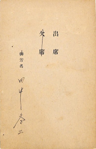 • 解説 櫻井勝美詩集出版記念会宛 ペン書 昭29・3・1(消印) 出欠状。署名のみ。(受信地)時間社 #八木書店近代自筆物/3.葉書類 code07668 ※自筆物につきましては、毎月25日前後に新蒐品を追加しております。PDF形式で御覧になりたい方は https://company.books-yagi.co.jp/archives/news/10928 を参照ください。