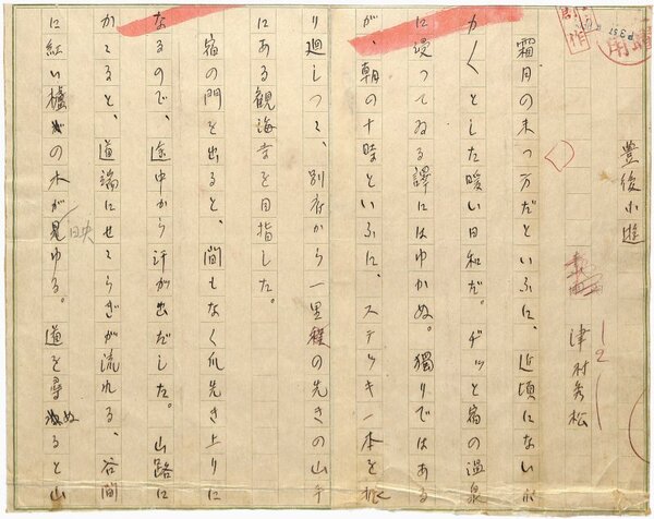 • 解説 『豊後小遊』 ペン書 原稿用紙1枚未完 裁断 貼合 大正~昭和初期において、新聞・雑誌の入稿媒体として実際に利用された草稿。(種別)紀行 #八木書店近代自筆物/1.草稿類 code04731 ※自筆物につきましては、毎月25日前後に新蒐品を追加しております。PDF形式で御覧になりたい方は https://company.books-yagi.co.jp/archives/news/10928 を参照ください。