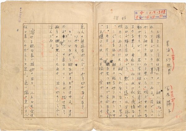 • 解説 『海の幻想』 ペン書 400字詰原稿用紙4枚完 傷み 雑誌巻頭の絵物語の体か。文末に「對島琴画」とある。(種別)小説 #八木書店近代自筆物/1.草稿類 #八木古書2025年6月新蒐 code09605 ※自筆物につきましては、毎月25日前後に新蒐品を追加しております。PDF形式で御覧になりたい方は https://company.books-yagi.co.jp/archives/news/10928 を参照ください。94号目録(R7.1)以後の追加は「#八木古書2025」で検索できます。