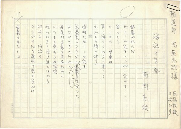 • 解説 『海辺の告発』 ペン書 400字詰原稿用紙3枚完 「報道部 高原光雄様」とある。(種別)現代詩 #八木書店近代自筆物/1.草稿類 #94号近代文学特輯 code08669 ※自筆物につきましては、毎月25日前後に新蒐品を追加しております。PDF形式で御覧になりたい方は https://company.books-yagi.co.jp/archives/news/10928 を参照ください。