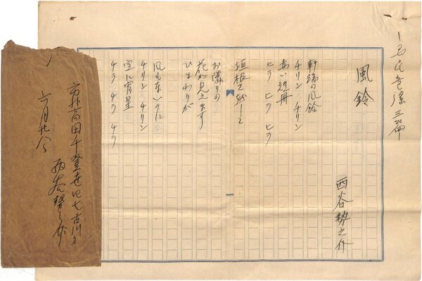 • 解説 『風鈴』他二篇 ペン書 400字詰原稿用紙3枚完 入稿封筒付 「風鈴」「闇夜の提灯」「雷さん」の三篇。「国民童謡三篇」とある。(種別)童謡 #八木書店近代自筆物/1.草稿類 #94号近代文学特輯 code07880 ※自筆物につきましては、毎月25日前後に新蒐品を追加しております。PDF形式で御覧になりたい方は https://company.books-yagi.co.jp/archives/news/10928 を参照ください。