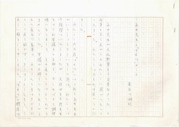 • 解説 『永井先生と「はせ川」のこと』 ペン書 400字詰原稿用紙12枚完 「永井龍男全集11巻月報」(講談社・昭57)掲載。6枚の草稿2種。下書きと入稿原稿か。(種別)回想 #八木書店近代自筆物/1.草稿類 #八木古書2025年3月新蒐 code09478 ※自筆物につきましては、毎月25日前後に新蒐品を追加しております。PDF形式で御覧になりたい方は https://company.books-yagi.co.jp/archives/news/10928 を参照ください。94号目録(R7.1)以後の追加は「#八木古書2025」で検索できます。