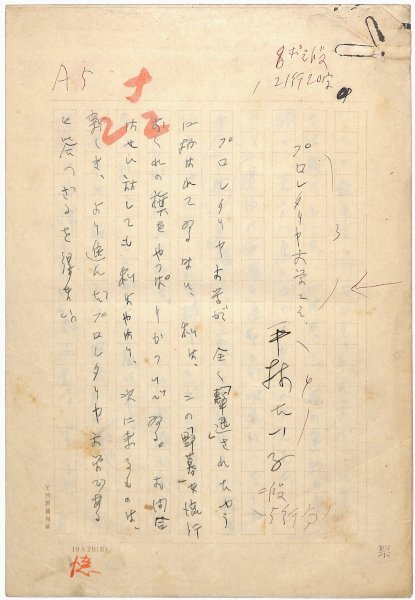 • 解説 『プロレタリア文学こそ』 ペン書 200字詰原稿用紙7枚未完 プロレタリア文学の現状分析。 文末欠。(種別)評論 #八木書店近代自筆物/1.草稿類 #94号近代文学特輯 code08847 ※自筆物につきましては、毎月25日前後に新蒐品を追加しております。PDF形式で御覧になりたい方は https://company.books-yagi.co.jp/archives/news/10928 を参照ください。