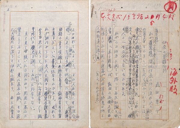 • 解説 『伊奈の今昔物語』 ペン書 200字詰原稿用紙25枚完 「苦楽海外版」の印がある。「信州伊奈の地に流れ込んで、そのまゝ二年近く」とあるので、昭和22年春の作か。(種別)随筆 #八木書店近代自筆物/1.草稿類 #94号近代文学特輯 code07127 ※自筆物につきましては、毎月25日前後に新蒐品を追加しております。PDF形式で御覧になりたい方は https://company.books-yagi.co.jp/archives/news/10928 を参照ください。