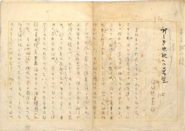 • 解説 『新しき世紀への希望』 ペン書 400字詰原稿用紙10枚完 劣化 コギトに載せた文章か。皇紀二千六百年を期に、あるべき文学の形を述べる。(種別)評論 #八木書店近代自筆物/1.草稿類 #94号近代文学特輯 code00232 ※自筆物につきましては、毎月25日前後に新蒐品を追加しております。PDF形式で御覧になりたい方は https://company.books-yagi.co.jp/archives/news/10928 を参照ください。
