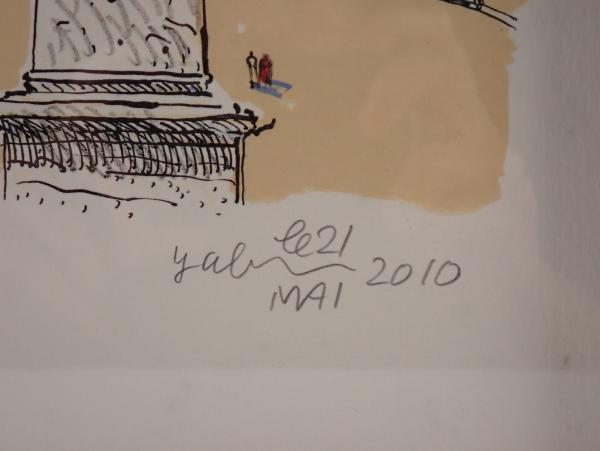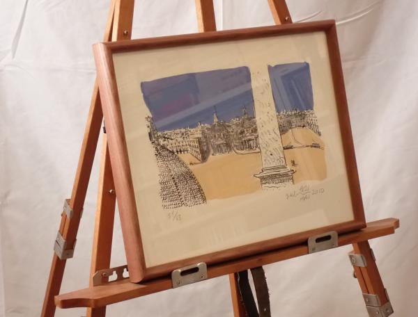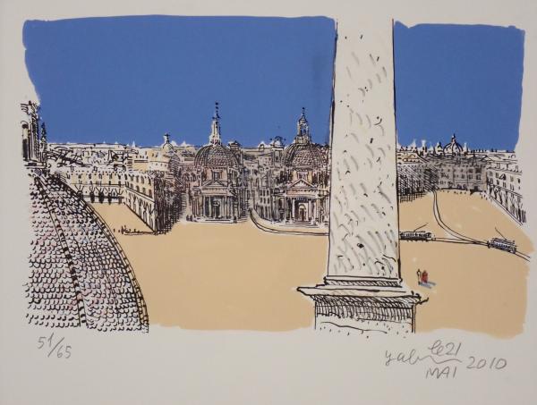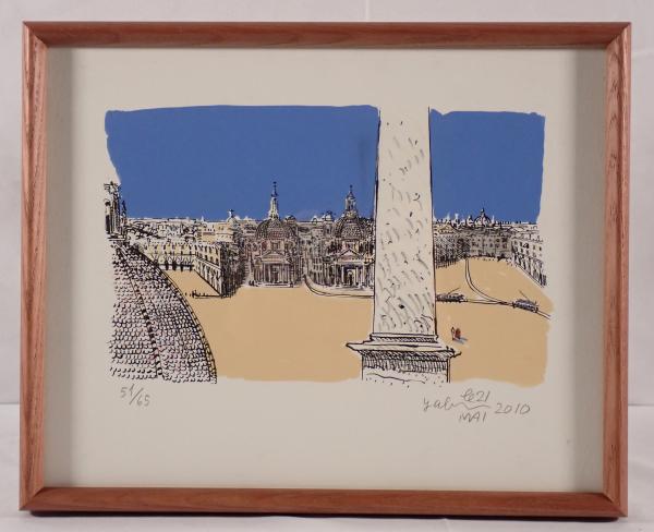 • 解説 洋画壇の重鎮・藪野健による、ローマのポポロ広場を描いた情緒豊かな作品です。2010年、日本芸術院会員就任を記念して制作された希少な一作。双子教会とオベリスクを主題に、オリジナルリトグラフに手彩色が施され、澄んだ青空と街並みの温かさが感じられます。限定65部のうち51番。額裏および共箱ラベルにより記念品であることが確認できます。作品・額ともに状態良好。額サイズ約40×32cm。希少性と記念性を兼ね備えたコレクター向け作品です。