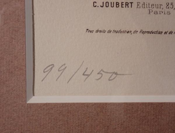 • 解説 アンリ・ド・トゥールーズ=ロートレックによるリトグラフ作品「子守歌(Berceuse)」です。1895年制作のオリジナル石版を使用し、20世紀屈指のパリ・ムルロー工房で刷られた真正な後刷り(リストライク)作品。左下に「99/450」の限定ナンバー入り。ゾラ夫人への献辞を含む猫と揺りかごの描写が特徴で、原版は刷り終了後キャンセレーション済。額装済みで状態良好。額サイズ約54.5×42.5cm。オリジナル原版を用いた正統なコレクター向け石版画です。