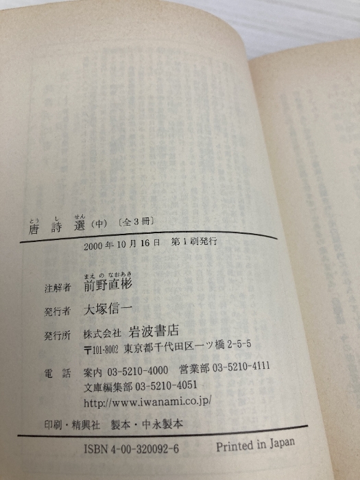 【※イタミ有】唐詩選 中 (岩波文庫 赤 9-2) 岩波書店 前野 直彬