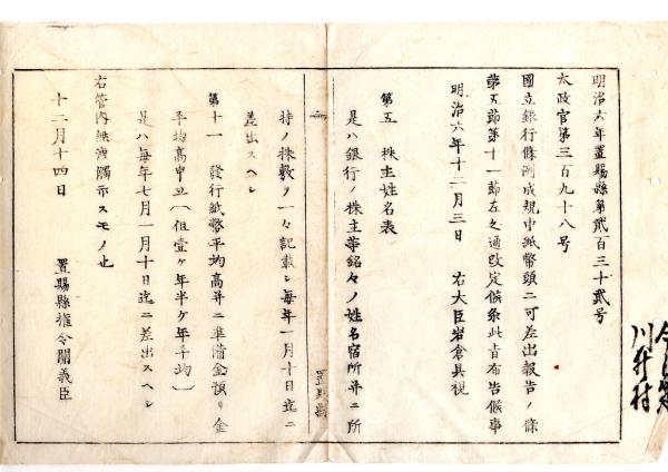 明治布告布達○国立銀行条例成規中 紙幣頭に差出可報告の条 第五節第十一節改定○明治6年 太政官布告 置賜県○和本古書古文書