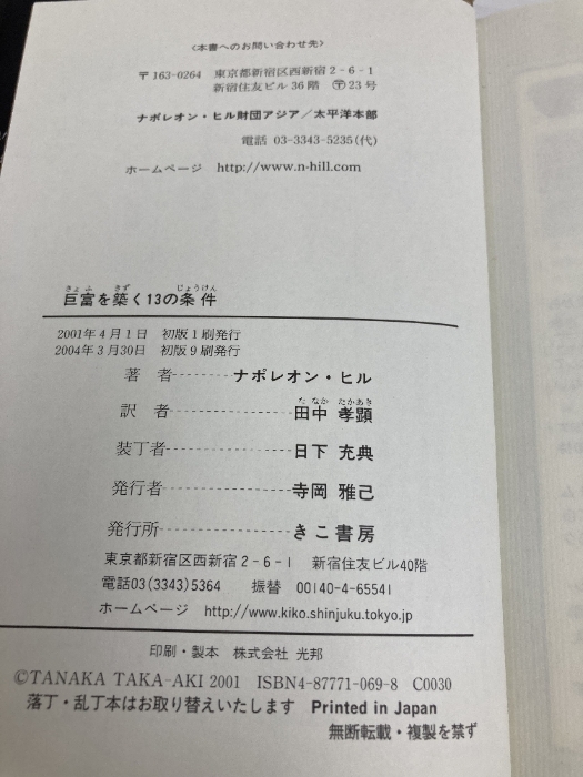 【※多数の書き込み有】巨富を築く13の条件 きこ書房 ヒル,ナポレオン