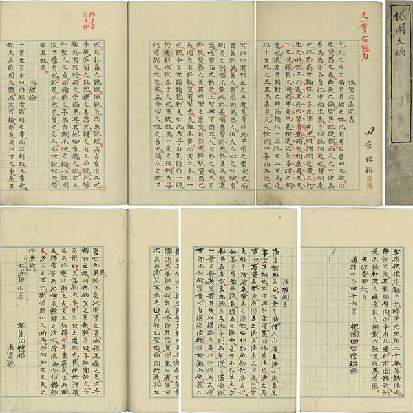 • 解説 一頁9行20字書 11枚 巻首に「田宮惇裕」と署して「槐園」朱印 「性習相遠近義」「内経論」「三従説」「序探月集」「蛍雪集序」「漁樵問答」収録 改装 26.4×17.7糎 裏打有 拵帙入