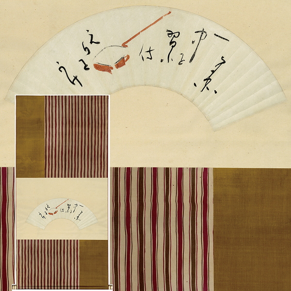 • 解説 『一中を習ふて (三味線の画) えりをかけ 南北』 筆彩 扇面12×42.5糎 幅面113×53.7糎 桐箱入 鶴屋南北(宝暦五1755~文政十二1829)江戸後期の脚本作者。四代。本名伊之助。生家は紺屋(染物屋)。中村座に入り、50歳で立作者(主席)となった。世話物、特に怪談物にすぐれ、代表作は「東海道四谷怪談」である。