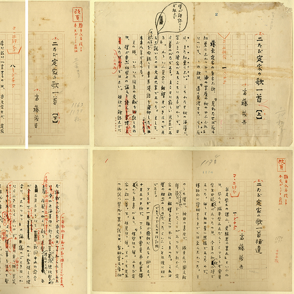 • 解説 『二たび定家の歌一首』 毛筆400字詰145枚完 帖仕立 二帖一帙 拵帙入 「アララギ」昭和6年10月号から翌年6月号の9回に分け、上・下・補遺(1~7)が掲載された。 上(1~7)39枚・下(8~14)22枚・補遺(1~7)22枚・補遺[2](8~10)15枚・補遺[3](11~12)9枚・補遺[4](13)4枚・補遺[5](14~18)6枚・補遺[6](19)8枚・補遺[7](20~23)20枚 藤原定家の有名な歌「見わたせば花も紅葉もなかりけり浦の苫屋の秋のゆふぐれ」について、「遠く見渡すと、もう花も、また紅葉もない。うちわたす秋の海濱に、苫ぶきの魚家があちこにあるばかりで ~」と大正6年にアララギ誌上で発表した論文を再びとりあげ、この歌を中心とした定家論をのべている。