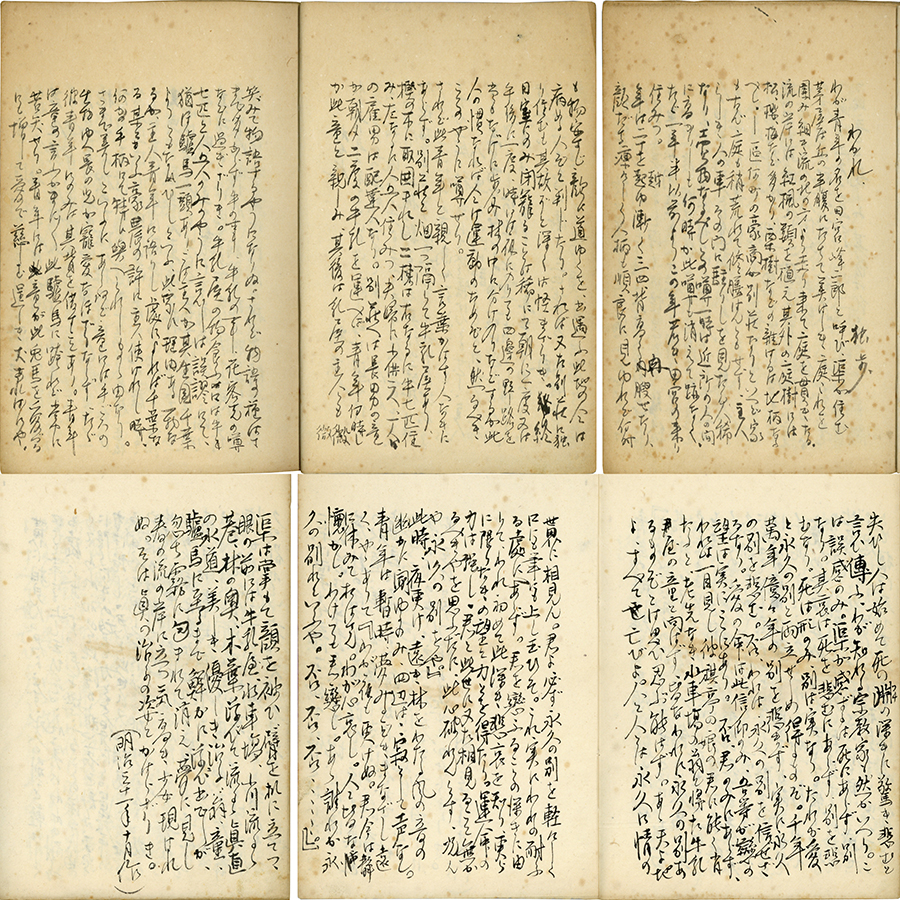 • 解説 『わかれ』 和紙に毛筆一紙50行書完 末に「明治三十一年十月作」 山折りに大和綴 明治31年10月発行「文藝倶楽部」に初載・第一文集「武蔵野」に収録 「わが青年の名を田宮峰二郎と呼ひ、渠が住む茅屋は丘の半腹にたちて美はしき庭これを圍み細き流の北の方より走り来て庭を貫きたり。流の岸には紅楓の類を植え其外の庭樹には松、櫻、梅など多かり、~」