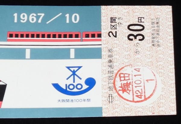 【切符】大阪開港100年記念 地下鉄普通乗車券 大阪市交通局 昭和42年/梅田から30円
