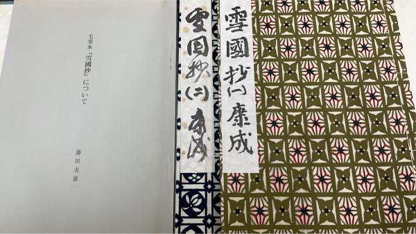 • 解説 帙箱。帙箱に和装本2冊・「毛筆本雪国抄について」冊子入。函にヤケ変色。少シミ。