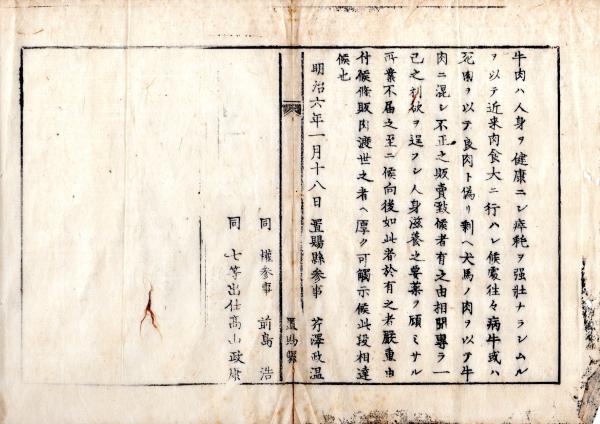 • 解説 N26012116○明治布告布達○近来牛肉食普及の処 病牛又は死肉を、或は犬馬の肉を牛に混入し不正販売の所業は不届きに付半肉渡世の者へ厳重に可触示○明治6年 置賜県布達○和本古書古文書