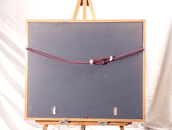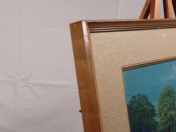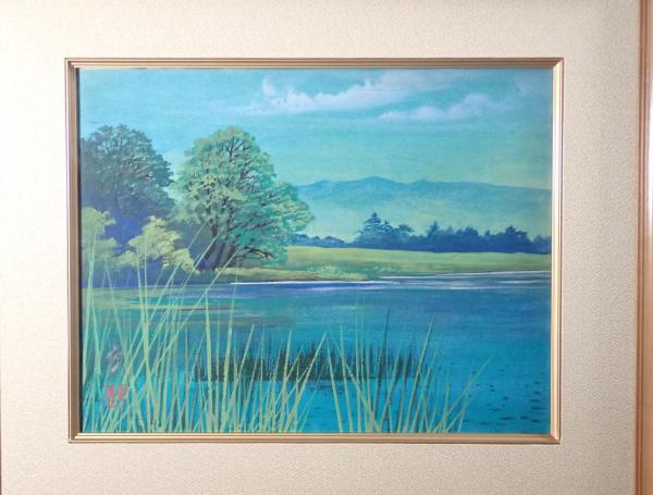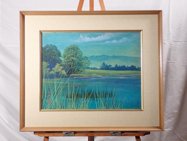 • 解説 銘「寛」による、静寂な湖畔を描いた美しい風景画です。手前の葦の緑と奥の湖や山々の青が、東山魁夷を思わせる清涼感と深い静けさを演出しています。技法は日本画調で、キャンバスまたは特殊紙への彩色(複製工芸画)の可能性があります。画寸約41×32cm、額寸約63×54cm、左下に署名と印入り。絵画本体は良好ですが、額縁にスレや当たり傷、裏吊り紐の劣化があります。和室やモダンなリビングに映える青の風景画としておすすめの一点です。