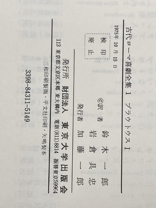 古代ローマ喜劇全集 第1巻 東京大学出版会 プラウトゥス※カバー無し