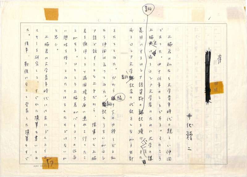 • 解説 『序/上脇進の飜訳』 ペン書 400字詰原稿用紙2枚完 テープ跡 タイトルは見せ消ち。戦後、露文学者上脇進の出版に際して序文を書いたか。(種別)序文 #八木書店近代自筆物/1.草稿類 #95号近代文学特輯 95409528 ※自筆物につきましては、毎月25日前後に新蒐品を追加しております。PDF形式で御覧になりたい方は https://company.books-yagi.co.jp/archives/news/10928 を参照ください。