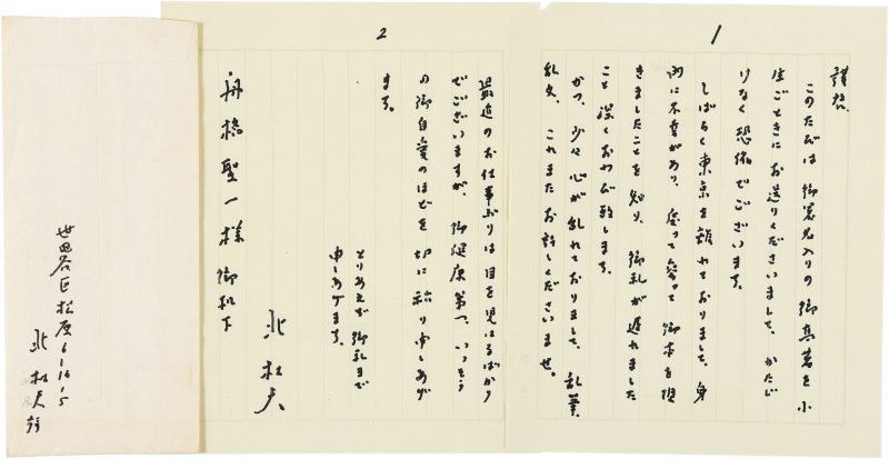 • 解説 舟橋聖一宛 ペン書 便箋2枚18行 消印不鮮明 戦後15円 献本礼状と近況報告。「しばらく東京を離れておりまして、身内に不幸があり、戻って參って御本を頂きましたことを知り、御礼が遅れましたこと深くおわび致します」。(発信地)世田谷区松原(受信地)新宿区下落合 #八木書店近代自筆物/2.書簡類 #95号近代文学特輯 95206439 ※自筆物につきましては、毎月25日前後に新蒐品を追加しております。PDF形式で御覧になりたい方は https://company.books-yagi.co.jp/archives/news/10928 を参照ください。