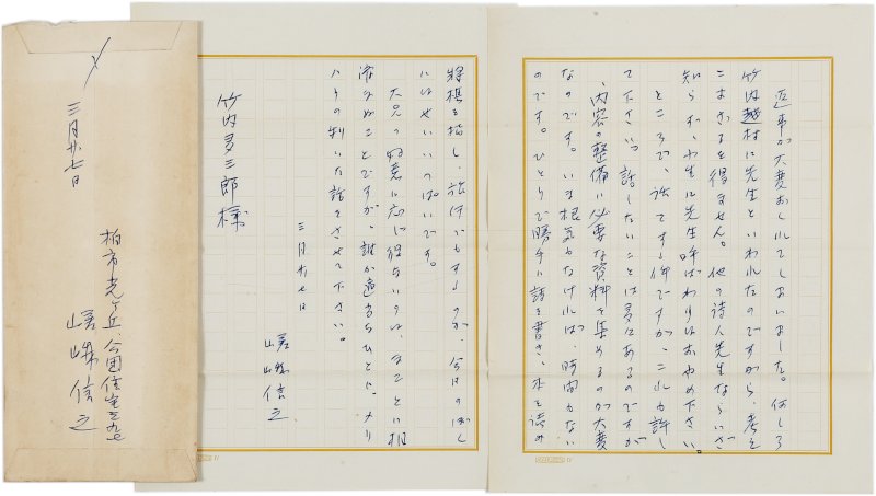 • 解説 竹内多三郎宛 ペン書 原稿用紙2枚17行 封筒付 昭38・8・27(消印) 講演の断り。「話をする件ですが、これも許して下さい。話したいことは多々あるのですが、内容の整備に必要な資料を集めるのが大変なのです。いま根気もなければ、時間もないのです。ひとりで勝手に詩を書き、本を読み将棋を指し、旅行でもするのが、今日のぼくにはせいいっぱいです」。(発信地)柏市光ヶ丘(受信地)京浜詩の会 #八木書店近代自筆物/2.書簡類 #95号近代文学特輯 95804338 ※自筆物につきましては、毎月25日前後に新蒐品を追加しております。PDF形式で御覧になりたい方は https://company.books-yagi.co.jp/archives/news/10928 を参照ください。