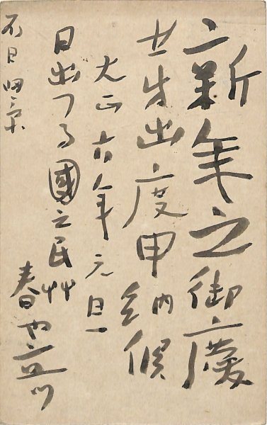 • 解説 島田賢平宛 毛筆 6行 大6・1・3(消印) 年賀状の返信。「新年の御慶應芽出度申納候 大正六年元旦 日出つる國の民艸春や立つ」。(受信地)牛込区若宮町 #八木書店近代自筆物/3.葉書類 #95号近代文学特輯 95705109 ※自筆物につきましては、毎月25日前後に新蒐品を追加しております。PDF形式で御覧になりたい方は https://company.books-yagi.co.jp/archives/news/10928 を参照ください。