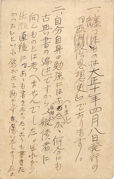 • 解説 國民新聞社學藝部宛 ペン書 7行 大14・10・4(消印) 処女出版について。「一、纏つたものは大正十年四月八日発行の『欧州政治思想史』であります。二、自分自身の勉強にはなりましたが、何分にも古典書の編述ですから、当時、一般讀者に向くものとは考へませんでした」。(受信地)京橋區日吉町 #八木書店近代自筆物/3.葉書類 #95号近代文学特輯 95901668 ※自筆物につきましては、毎月25日前後に新蒐品を追加しております。PDF形式で御覧になりたい方は https://company.books-yagi.co.jp/archives/news/10928 を参照ください。
