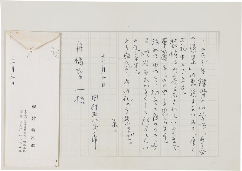 • 解説 舟橋聖一宛 ペン書 原稿用紙13行 封筒付 昭38・11・3(消印) 「ある女の遠景」献本礼状。「装幀も内容にふさわしい重厚で、華麗なもののやうに思ひます。改めてゆつくり初冬の夜のたのしみに、燈火をあかるくして拝見したいと存じます」。(発信地)杉並区神明町(受信地)新宿区下落合 #八木書店近代自筆物/2.書簡類 #95号近代文学特輯 95109049 ※自筆物につきましては、毎月25日前後に新蒐品を追加しております。PDF形式で御覧になりたい方は https://company.books-yagi.co.jp/archives/news/10928 を参照ください。
