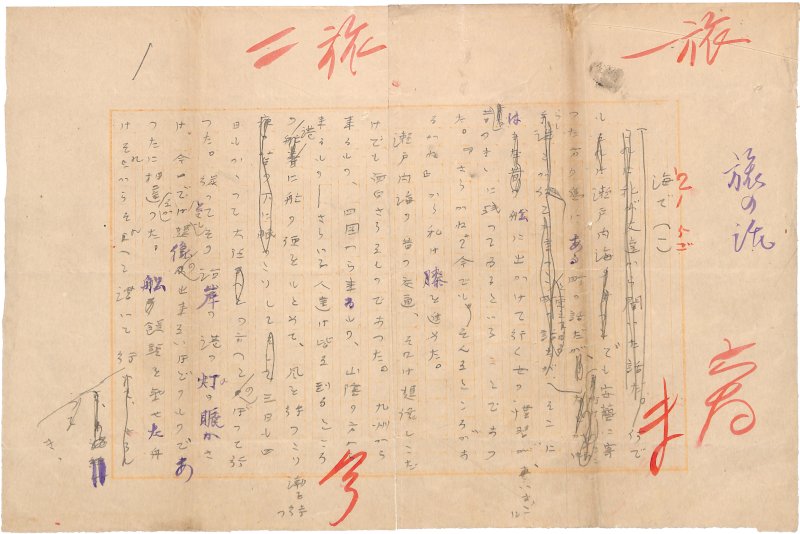 • 解説 『旅の話』44 鉛筆 400字詰原稿用紙12枚完 裁断 傷み 無署名 単行本「旅の話」の44章。目次では「瀬戸内海の御手洗港に残つてゐる昔の遊女船」「美保神社の御神楽」「関の五本松」の部分。新聞入稿時の題名は「海で」(1)~(4)。(種別)紀行 #八木書店近代自筆物/1.草稿類 #95号近代文学特輯 95909717 ※自筆物につきましては、毎月25日前後に新蒐品を追加しております。PDF形式で御覧になりたい方は https://company.books-yagi.co.jp/archives/news/10928 を参照ください。
