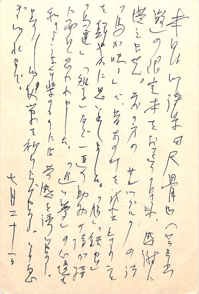 • 解説 糸屋鎌吉宛 ペン書 10行 昭61・7・31(消印) 住所印 献本礼状。「御詩集『尺骨』(芸立出版)の限定本をお送り下され、感謝に堪えません。前の方のサルツブルクの詩『鳥が映る』で、昔あの町を訪れたときのことを鮮やかに思い出しました。『鳩』『鋏虫』『鳥達』『雉子』など一連の動物の詩が特に面白く思われました」。(発信地)文京区小日向(受信地)世田谷区砧 #八木書店近代自筆物/3.葉書類 #95号近代文学特輯 95110707 ※自筆物につきましては、毎月25日前後に新蒐品を追加しております。PDF形式で御覧になりたい方は https://company.books-yagi.co.jp/archives/news/10928 を参照ください。