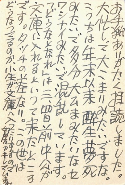 • 解説 白川充宛 ペン書 9行 昭55・6・21(消印) 文庫収録の交渉。「『どうなとなれ』は三、四日前中公が文庫に入れるといつて来たところです。タッチの差なり」。(発信地)大阪府茨木市(受信地)講談社文庫係 #八木書店近代自筆物/3.葉書類 #95号近代文学特輯 95407819 ※自筆物につきましては、毎月25日前後に新蒐品を追加しております。PDF形式で御覧になりたい方は https://company.books-yagi.co.jp/archives/news/10928 を参照ください。