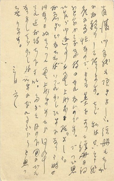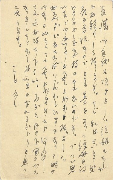• 解説 小澤蕭彌宛 ペン書 10行 大15・3・6(消印) 揮毫の遅れを詫びる。「御手紙も頂きました。短冊もたしかにお預かりして居ります。たゞ私は只今非常に多忙なので、とても墨をすって短冊に向ふといふやうな気持になれないのです。でつひ思ひ乍ら御返事も差し上げずに居りました。お急ぎでなければいづれ少しひまになった時に何なりとぬたくって差上げますから何卆それ迄御待ちくださいますか。たぶん月の下旬でもなりましたら少しはひまになれるだらうと思って居ります」。(発信地)京都市(受信地)諏訪郡湊村 #八木書店近代自筆物/3.葉書類 #95号近代文学特輯 95111760 ※自筆物につきましては、毎月25日前後に新蒐品を追加しております。PDF形式で御覧になりたい方は https://company.books-yagi.co.jp/archives/news/10928 を参照ください。