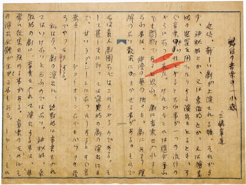 • 解説 『舞台の音楽の一小感』 ペン書 原稿用紙1枚未完 裁断 貼合 20行 大正~昭和初期において、新聞・雑誌の入稿媒体として実際に利用された草稿。(種別)資料 #八木書店近代自筆物/1.草稿類 #95号近代文学特輯 95109094 ※自筆物につきましては、毎月25日前後に新蒐品を追加しております。PDF形式で御覧になりたい方は https://company.books-yagi.co.jp/archives/news/10928 を参照ください。
