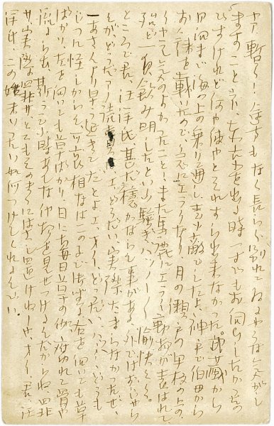 • 解説 正富汪洋宛 ペン書 15行 明38・7・23(本文) 消印不鮮明 旅先からの便り。「ヤア暫く! 途方もなく長らく別れてゐるやうな気がしますことネ。東京を出るとき一寸でもお伺ひしたかったのですけれど何や彼やとそれすら出来なかった。武蔵から日向まで海の上の乗り通し、素敵でしたよ、神戸で伯母からお銭を頂いたので、急にエラクなり、月の瀬戸の甲板の上の、イヤ元気のよかったこと!」。(発信地)日向東臼杵郡東郷村拝谷(受信地)芝愛宕下町 #八木書店近代自筆物/3.葉書類 #95号近代文学特輯 95811610 ※自筆物につきましては、毎月25日前後に新蒐品を追加しております。PDF形式で御覧になりたい方は https://company.books-yagi.co.jp/archives/news/10928 を参照ください。