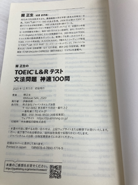 【※カバー無し】関正生の TOEIC® L&Rテスト 文法問題 神速100問 (神速シリーズ) ジャパンタイムズ出版 関 正生