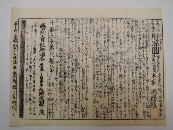• 解説 江戸後期の有名な小児薬「肝涼圓」の宣伝用のチラシ 当時「十粒入銀八分」で京本家・堀勝蔵の売薬が芸州で宣伝されていたことを知る貴重な史料 保存良好<登録書籍は店頭にない場合がありますので、ご来店の場合は前日までにご連絡下さい>