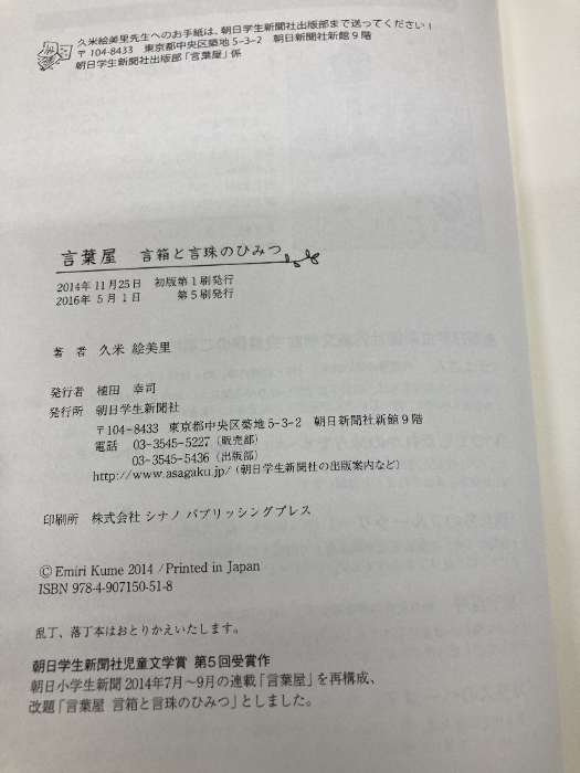 言葉屋 言箱と言珠のひみつ (朝日小学生新聞の人気連載小説) 朝日学生新聞社 久米絵美里