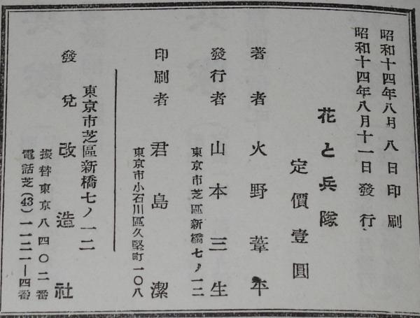 • 解説 火野葦平 花と兵隊 改造社 昭和14年8月発行 B6判.