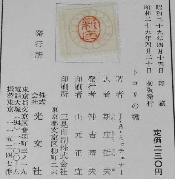 • 解説 トコリの橋 ジエームス・A.ミッチェナー 光文社 昭和29年4月初版 B6判ハードカバー帯付.