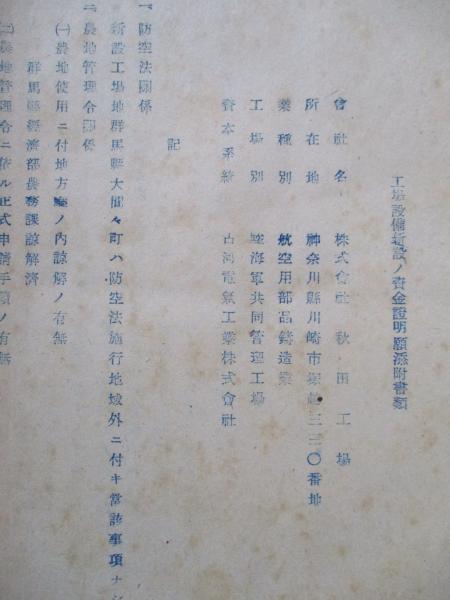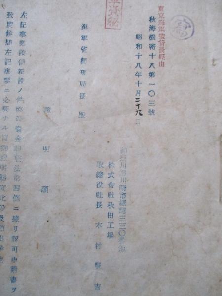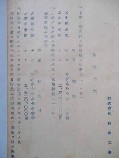 株式會社秋田工場社長木村豊吉から海軍省經理局長へ。工場設備新設ノ資金證明願添附書類、擴張要項、主要幹部略歴など。