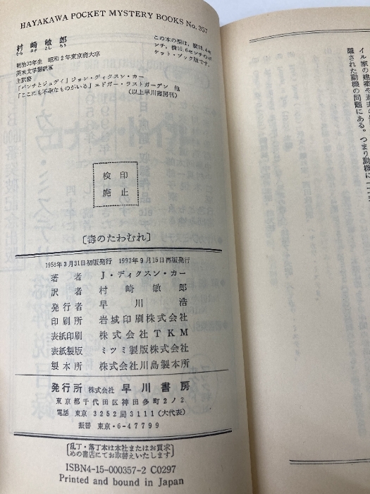 毒のたわむれ (ハヤカワ・ミステリ 357) 早川書房 J.ディクスン カー