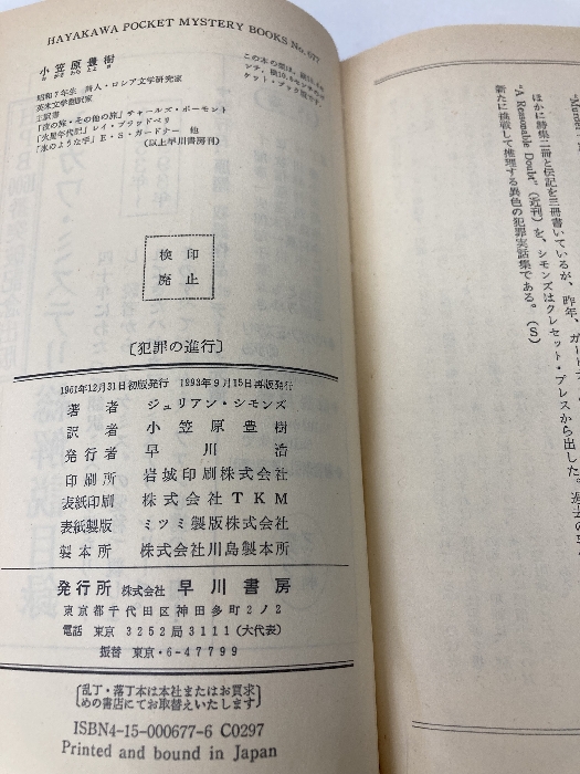 犯罪の進行 (ハヤカワ・ミステリ 677) 早川書房 ジュリアン シモンズ