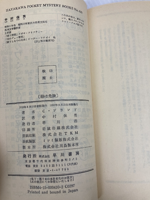 緑は危険 (ハヤカワ・ポケット・ミステリ 410) 早川書房 クリスチアナ ブランド