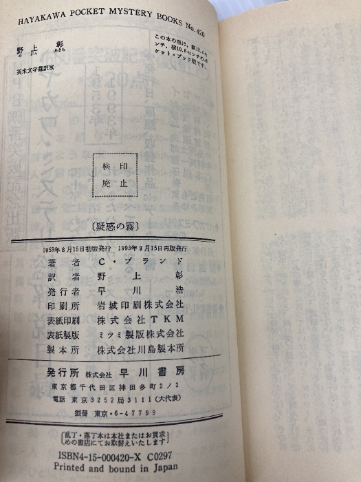 疑惑の霧 (ハヤカワ・ミステリ 420) 早川書房 クリスティアナ ブランド