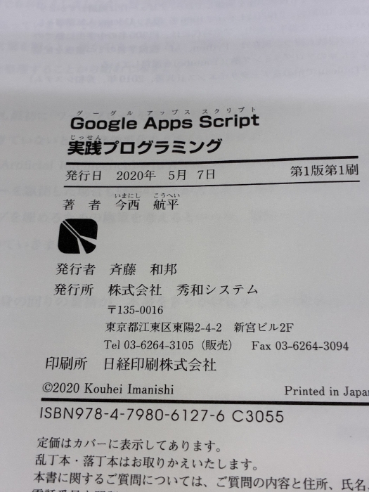 GoogleAppsScript実践プログラミング 秀和システム 航平, 今西