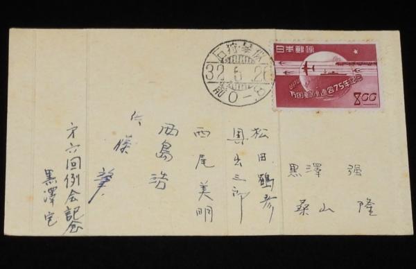 「ウラ面に万国郵便連合75年記念切手貼付、消印(石狩・琴似)、連盟署名あり」