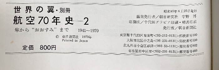 世界の翼・別冊『航空70年史(2)』隼から”おおすみ” まで1941-1970 朝日新聞社 1970年
