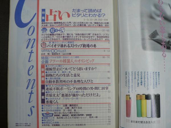 • 解説 南伸坊占い館探検&占い入門/おみくじ作り方/原律子〈ストリップ劇場〉/〈特別企画:フツーの韓国人のオリンピック体験〉菅原文太インタビュー/「悪魔くん」ほか 少ヤケ・シミ・スレ
