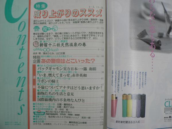 • 解説 成り上がりスゴロク/映画や小説に見る成り上がり分析/呉智英「思想と成り上がり」/原律子〈新宿十二社天然温泉〉/〈特別企画:あの職業はどこいった?(バスガール・桶屋・賄い付き下宿ほか)/赤井英和インタビュー/「リボンの騎士」ほか 少ヤケ・シミ・スレ